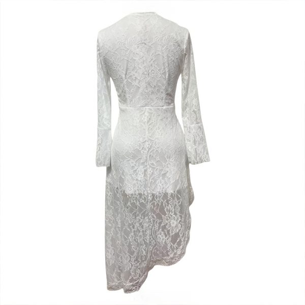 This stunning dress features a dramatic deep V-neckline that elongates the silhouette, complemented by long sleeves that add graceful coverage. The delicate lace trim adorns the artistic irregular hemline , creating a romantic finish that sways with every movement. Crafted from 95% polyester/5% spandex , this dress offers comfortable stretch and beautiful drape, making it perfect for warm weather occasions. The flowy A-line silhouette sweeps into an ankle-length skirt that moves effortlessly. The smocked back ensures a flexible fit across sizes S-XXL , while the lightweight fabric keeps you cool and comfortable.