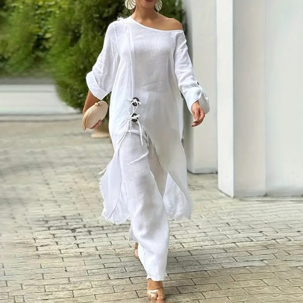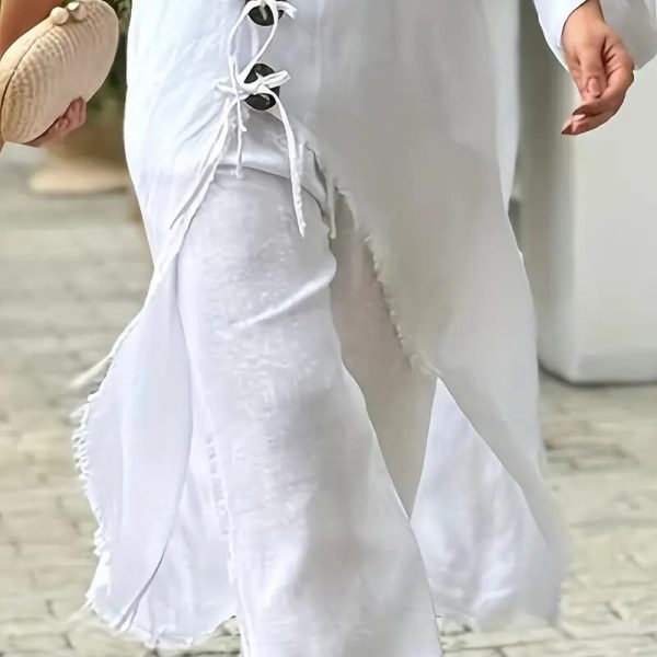 This unique two-piece ensemble features an asymmetrical open-front robe with natural wood button detailing and a matching inner slip dress designed for off-shoulder styling. The flowy oversized cut creates dramatic movement, while the irregular hemline adds artistic flair. Crafted from 95% polyester/5% elastane , this set offers luxurious drape with comfortable stretch, making it perfect for warm weather lounging. The breathable fabric and relaxed silhouette provide ultimate comfort for indoor and outdoor relaxation. The adjustable tie closure allows for customizable coverage and fit. Available in sizes S-XXL to suit various body types.